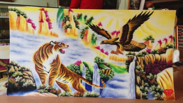 Tranh đá quý anh hùng tương ngộ có nội dung là hình ảnh đại bàng và hổ đối mặt nhau. Đây là hai loài vật vô cùng linh thiêng một là bá chủ trời xanh, một là chúa tể rừng xanh. Đối với sự kết hợp này thì không một ai có thể khuất phục được.Bức tranh nhiều màu sắc hoàn toàn rất phù hợp với những người thuộc mệnh Kim. Giúp cho họ luôn luôn tự tin và ngẩng cao đầu, nhờ vào đó đường công danh cũng thuận lợi và trải đầy hoa hồng.