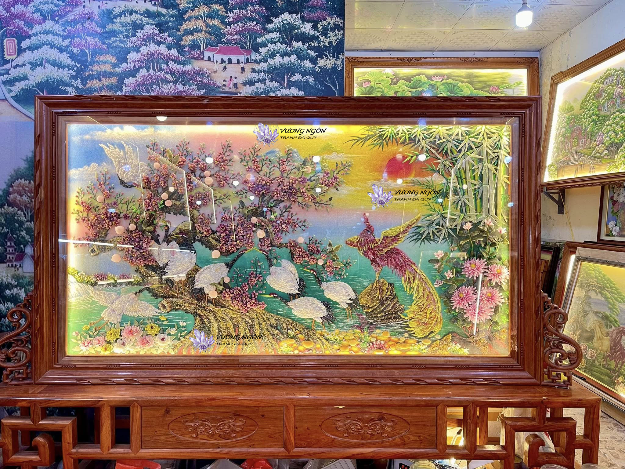 Sự kết hợp giữa chim hạc, phượng hoàng và hoa đào tạo nên một tác phẩm nghệ thuật vừa giàu ý nghĩa tâm linh, vừa nâng tầm không gian sống. Đây là lựa chọn hoàn hảo cho phòng khách, phòng làm việc hoặc làm quà biếu tặng cao cấp.
