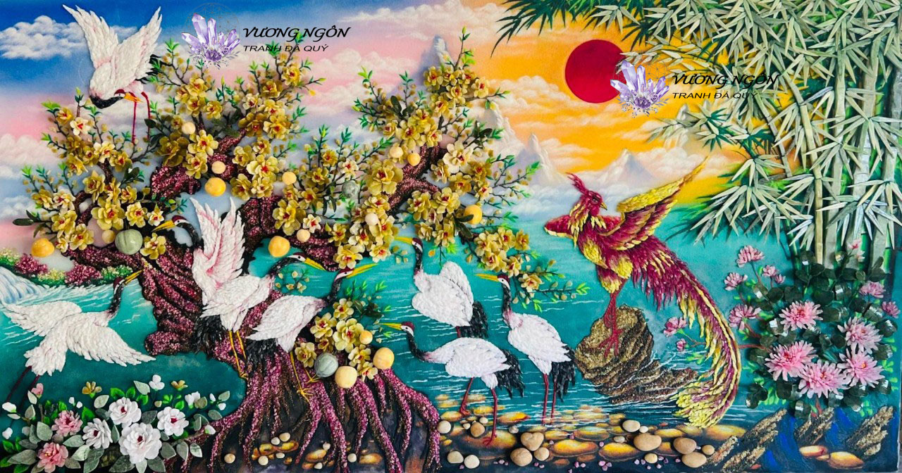 Tranh đá quý đào hạc phượng hoàng trường thọ là dòng tranh phong thủy cao cấp được nhiều gia đình Việt ưa chuộng. Không chỉ mang vẻ đẹp sang trọng, tinh xảo, bức tranh còn hội tụ đầy đủ các yếu tố phong thủy như trường thọ – may mắn – thịnh vượng – tài lộc.