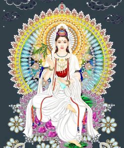 Đây là một bức tranh khác rất phổ biến trong sản phẩm tranh đá quý Phật giáo. Bức tranh thể hiện hình ảnh của Phật Bà Quan Âm đang ngồi trên toà sen, tay cầm bình cam lộ cùng cành dương liễu. Bức tranh này mang ý nghĩa của sự từ bi, cứu độ và che chở.