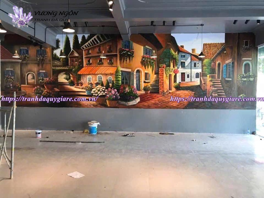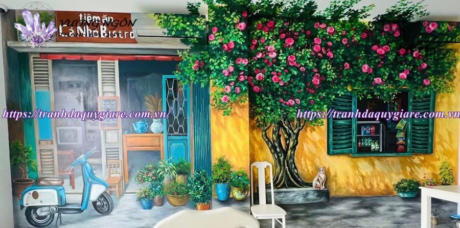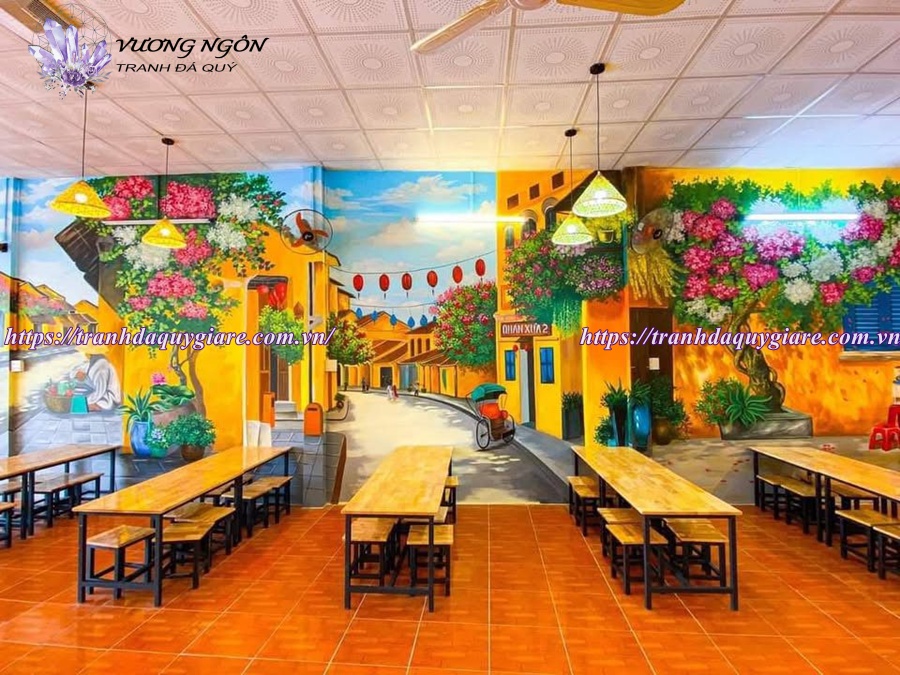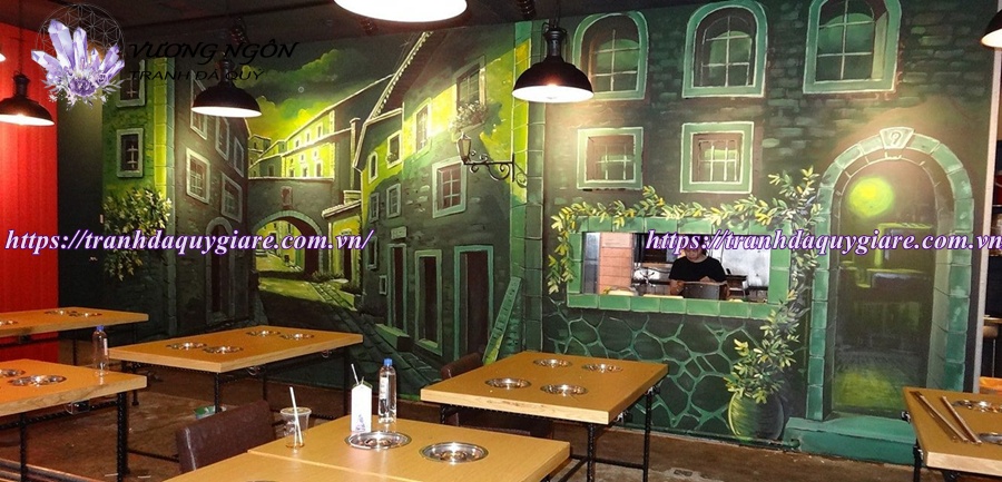 - Khắc phục nhược điểm mặt bằng: Tranh 3D hoặc tranh phối cảnh giúp “ăn gian” không gian, làm quán rộng rãi hơn và che đi các bức tường xấu, mốc meo.