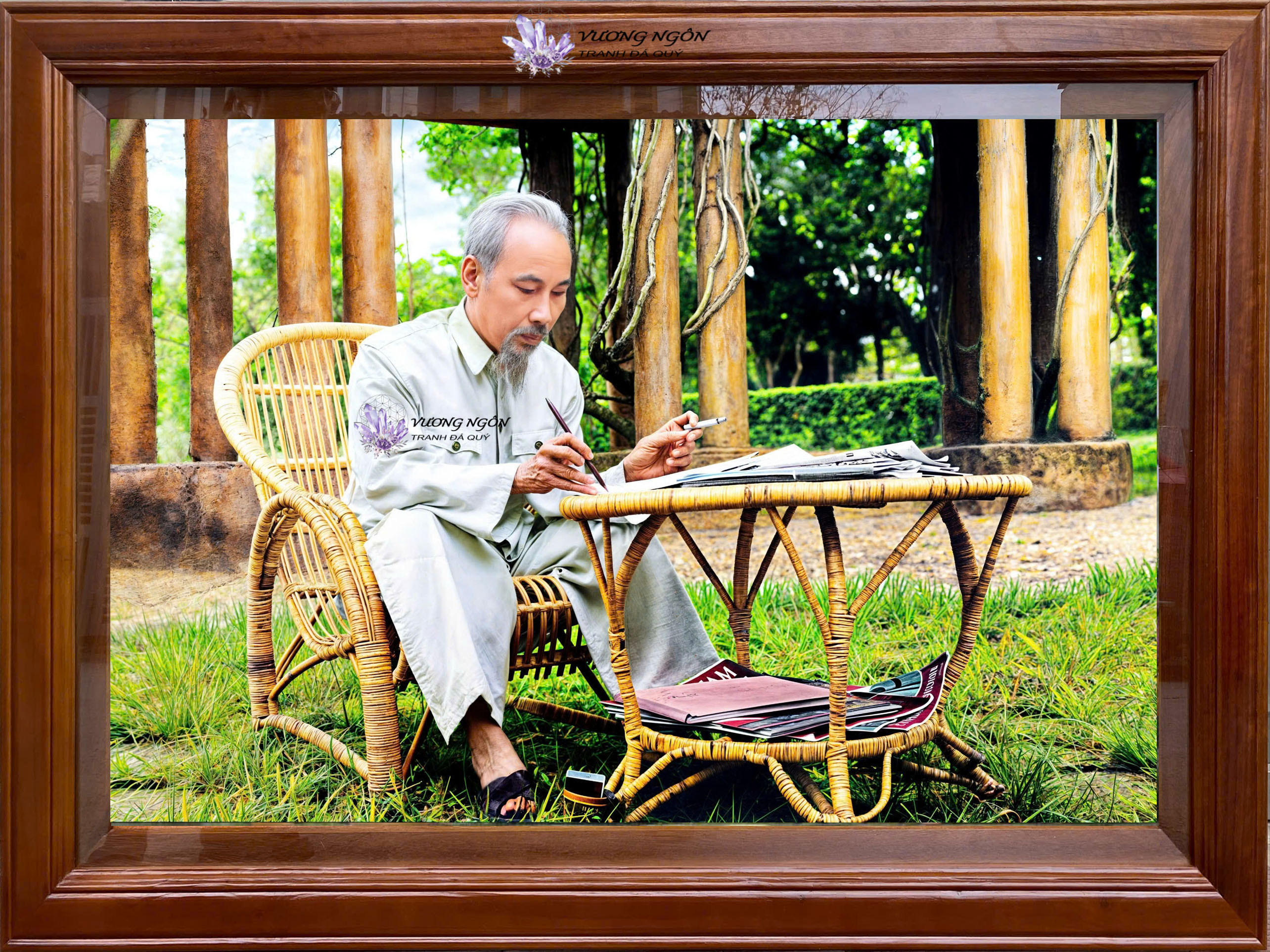 Hình ảnh Bác suy tư hoặc làm việc bên bàn đá thể hiện tinh thần tận tụy, trí tuệ và sự giản dị trong cuộc sống hằng ngày. Bức tranh không chỉ mang giá trị nghệ thuật mà còn gợi nhắc về tấm gương đạo đức, lối sống thanh cao của vị lãnh tụ kính yêu. Đây là chủ đề tranh rất ý nghĩa, thường được treo tại phòng truyền thống, cơ quan hoặc phòng khách trang trọng.